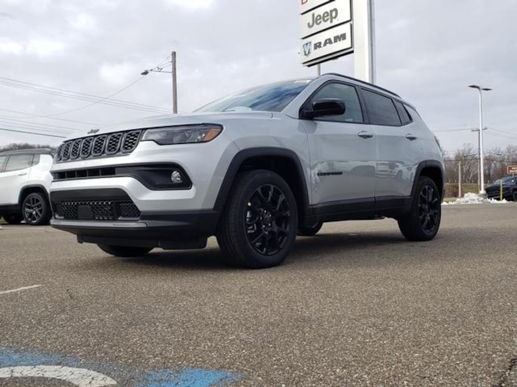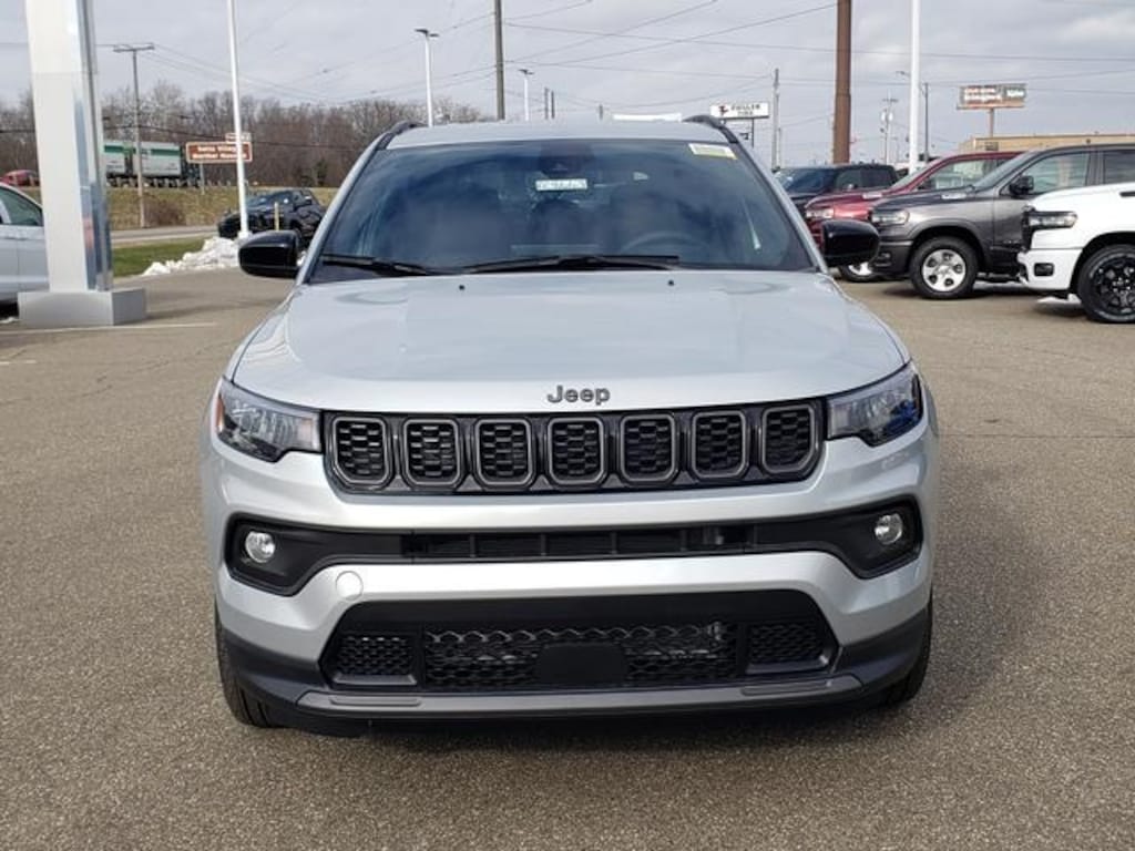 Silver Zynith Metallic Clearcoat 2026 Jeep Compass Latitude 4WD 8-Speed Automatic 2.0L I4 DOHC 10.1" Touchscreen Display, 17" x 7" Aluminum Wheels, 3.73 Final Drive Ratio, 4-Wheel Disc Brakes, 4G LTE Wi-Fi Hot Spot, 6 Speakers, ABS brakes, Air Conditioning, Altitude Special Edition, AM/FM radio: SiriusXM, Auto High-beam Headlights, Automatic temperature control, Black Day Light Opening Moldings, Bluetooth Handsfree Phone and Audio, Brake assist, Bumpers: body-color, Compass, Delay-off headlights, Driver door bin, Driver vanity mirror, Dual front impact airbags, Dual front side impact airbags, Electronic Stability Control, Emergency communication system: SiriusXM Guardian, Four wheel independent suspension, Front anti-roll bar, Front Bucket Seats, Front Center Armrest w/Storage, Front fog lights, Front License Plate Bracket, Front reading lights, Fully automatic headlights, Global Telematics Box Module, Gloss Black Surround/Neutral Gray Rings, Heated door mirrors, Heated front seats, Heated steering wheel, Illuminated entry, Knee airbag, Leather Shift Knob, Leather steering wheel, Low tire pressure warning, MyFlexCare Service Plan, Neutral Gray Exterior Badging, Occupant sensing airbag, Outside temperature display, Overhead airbag, Overhead console, Panic alarm, ParkView Rear Back-Up Camera, Passenger door bin, Passenger vanity mirror, Piano Black Interior Accents, Power door mirrors, Power steering, Power windows, Premium audio system: UConnect 5, Premium Cloth/Vinyl Bucket Seats, Quick Order Package 29N Altitude, Radio: Uconnect 5 with 8.4" Display, Rear anti-roll bar, Rear seat center armrest, Rear window defroster, Rear window wiper, Remote keyless entry, Security system, SiriusXM Satellite Radio, Sliding Sun Visors with Illuminated Mirrors, Speed control, Split folding rear seat, Spoiler, Steering wheel mounted audio controls, Tachometer, Telescoping steering wheel, Tilt steering wheel, Traction control, Trip computer, Variably intermittent wipers, Wheels: 18" x 7" Gloss Black Painted Aluminum.