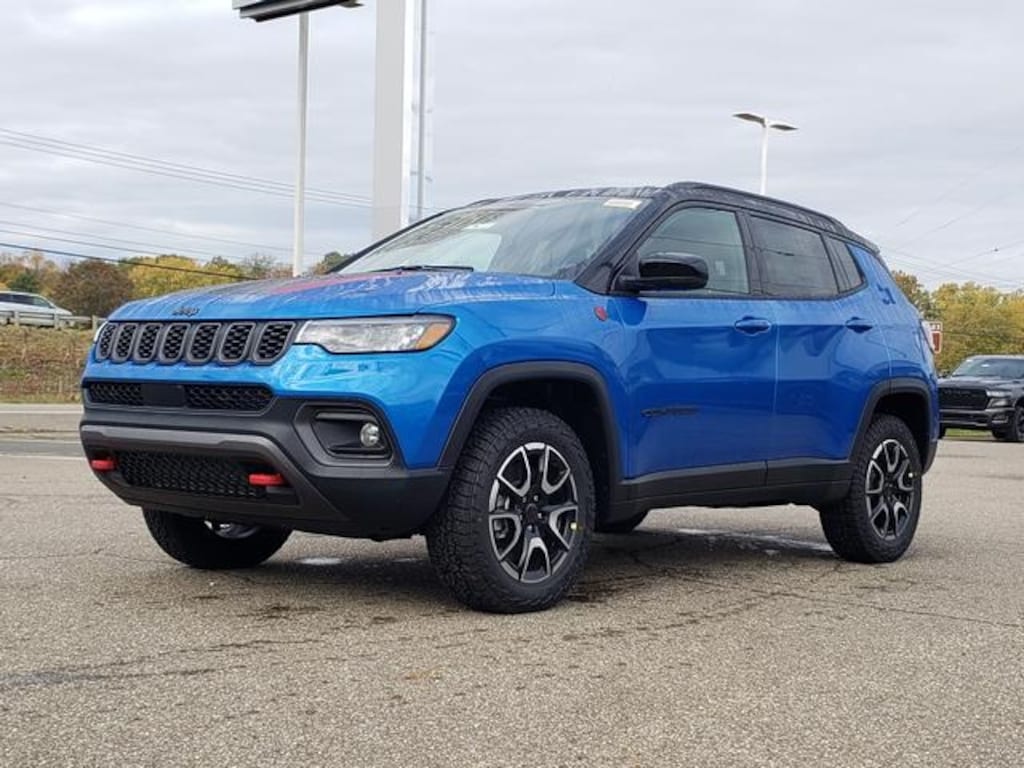Hydro Blue Pearlcoat 2026 Jeep Compass Trailhawk 4WD 8-Speed Automatic 2.0L I4 DOHC 10.1" Touchscreen Display, 4-Wheel Disc Brakes, 4.398 Final Drive Ratio, 6 Speakers, ABS brakes, Air Conditioning, Alloy wheels, AM/FM radio: SiriusXM, Auto High-beam Headlights, Auto-dimming Rear-View mirror, Automatic temperature control, Brake assist, Bumpers: body-color, Compass, Delay-off headlights, Driver door bin, Driver vanity mirror, Dual front impact airbags, Dual front side impact airbags, Electronic Stability Control, Emergency communication system, Four wheel independent suspension, Front anti-roll bar, Front Bucket Seats, Front Center Armrest w/Storage, Front dual zone A/C, Front fog lights, Front License Plate Bracket, Front reading lights, Fully automatic headlights, Heated door mirrors, Heated front seats, Heated steering wheel, Illuminated entry, Knee airbag, Leather Shift Knob, Leather steering wheel, Low tire pressure warning, MyFlexCare Service Plan, Occupant sensing airbag, Outside temperature display, Overhead airbag, Overhead console, Panic alarm, ParkView Rear Back-Up Camera, Passenger door bin, Passenger vanity mirror, Power door mirrors, Power driver seat, Power Liftgate, Power steering, Power windows, Premium Cloth/Leather Trim Bucket Seats, Quick Order Package 29E, Radio: Uconnect 5 w/10.1" Display, Rain sensing wipers, Rear anti-roll bar, Rear seat center armrest, Rear window defroster, Rear window wiper, Remote keyless entry, Security system, Speed control, Split folding rear seat, Spoiler, Steering wheel mounted audio controls, Tachometer, Telescoping steering wheel, Tilt steering wheel, Traction control, Trip computer, Turn signal indicator mirrors, Variably intermittent wipers, Wheels: 17" x 6.5" Painted Black Aluminum.