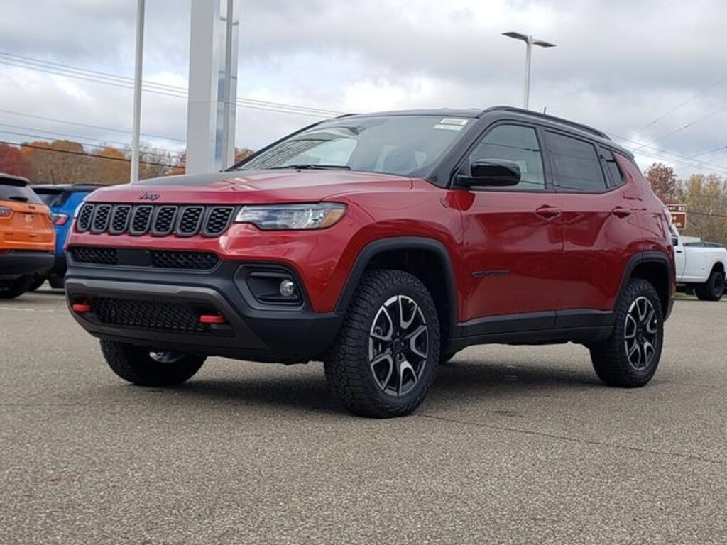red hot pearlcoat 2026 Jeep Compass Trailhawk 4WD 8-Speed Automatic 2.0L I4 DOHC 10.1" Touchscreen Display, 4-Wheel Disc Brakes, 4.398 Final Drive Ratio, 4G LTE Wi-Fi Hot Spot, 6 Speakers, ABS brakes, Air Conditioning, Alloy wheels, AM/FM radio: SiriusXM, Auto High-beam Headlights, Auto-dimming Rear-View mirror, Automatic temperature control, Brake assist, Bumpers: body-color, Compass, Delay-off headlights, Driver door bin, Driver vanity mirror, Dual front impact airbags, Dual front side impact airbags, Electronic Stability Control, Emergency communication system: SiriusXM Guardian, Four wheel independent suspension, Front anti-roll bar, Front Bucket Seats, Front Center Armrest w/Storage, Front dual zone A/C, Front fog lights, Front License Plate Bracket, Front reading lights, Fully automatic headlights, Global Telematics Box Module, Heated door mirrors, Heated front seats, Heated steering wheel, Illuminated entry, Knee airbag, Leather Shift Knob, Leather steering wheel, Low tire pressure warning, MyFlexCare Service Plan, Occupant sensing airbag, Outside temperature display, Overhead airbag, Overhead console, Panic alarm, ParkView Rear Back-Up Camera, Passenger door bin, Passenger vanity mirror, Power door mirrors, Power driver seat, Power Liftgate, Power steering, Power windows, Premium audio system: UConnect 5, Premium Cloth/Leather Trim Bucket Seats, Quick Order Package 29E, Radio: Uconnect 5 with 10.1" Display, Rain sensing wipers, Rear anti-roll bar, Rear seat center armrest, Rear window defroster, Rear window wiper, Remote keyless entry, Security system, SiriusXM Guardian - Included Trail (B), SiriusXM Radio Service, Speed control, Split folding rear seat, Spoiler, Steering wheel mounted audio controls, Tachometer, Telescoping steering wheel, Tilt steering wheel, Traction control, Trip computer, Turn signal indicator mirrors, Variably intermittent wipers, Wheels: 17" x 6.5" Painted Black Aluminum.