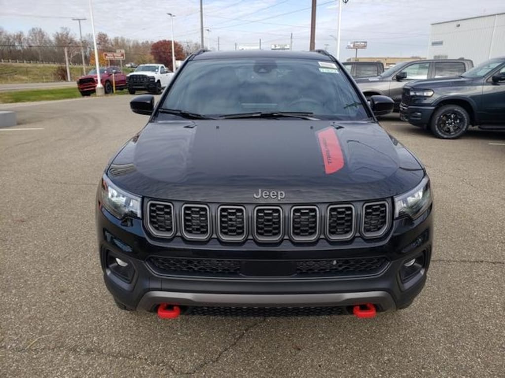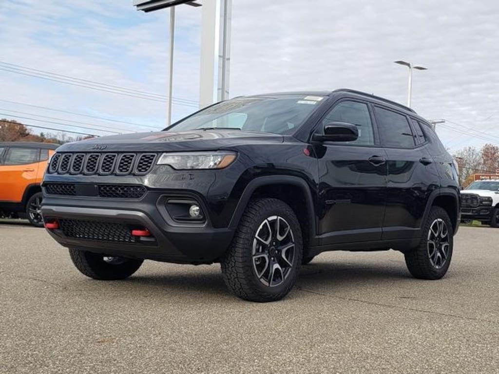 iamond Black Crystal Pearlcoat 2026 Jeep Compass Trailhawk 4WD 8-Speed Automatic 2.0L I4 DOHC 10.1" Touchscreen Display, 4-Wheel Disc Brakes, 4.398 Final Drive Ratio, 4G LTE Wi-Fi Hot Spot, 6 Speakers, ABS brakes, Air Conditioning, Alloy wheels, AM/FM radio: SiriusXM, Auto High-beam Headlights, Auto-dimming Rear-View mirror, Automatic temperature control, Brake assist, Bumpers: body-color, Compass, Delay-off headlights, Driver door bin, Driver vanity mirror, Dual front impact airbags, Dual front side impact airbags, Electronic Stability Control, Emergency communication system: SiriusXM Guardian, Four wheel independent suspension, Front anti-roll bar, Front Bucket Seats, Front Center Armrest w/Storage, Front dual zone A/C, Front fog lights, Front License Plate Bracket, Front reading lights, Fully automatic headlights, Global Telematics Box Module, Heated door mirrors, Heated front seats, Heated steering wheel, Illuminated entry, Knee airbag, Leather Shift Knob, Leather steering wheel, Low tire pressure warning, MyFlexCare Service Plan, Occupant sensing airbag, Outside temperature display, Overhead airbag, Overhead console, Panic alarm, ParkView Rear Back-Up Camera, Passenger door bin, Passenger vanity mirror, Power door mirrors, Power driver seat, Power Liftgate, Power steering, Power windows, Premium audio system: UConnect 5, Premium Cloth/Leather Trim Bucket Seats, Quick Order Package 29E, Radio: Uconnect 5 with 10.1" Display, Rain sensing wipers, Rear anti-roll bar, Rear seat center armrest, Rear window defroster, Rear window wiper, Remote keyless entry, Security system, SiriusXM Guardian - Included Trail (B), SiriusXM Radio Service, Speed control, Split folding rear seat, Spoiler, Steering wheel mounted audio controls, Tachometer, Telescoping steering wheel, Tilt steering wheel, Traction control, Trip computer, Turn signal indicator mirrors, Variably intermittent wipers, Wheels: 17" x 6.5" Painted Black Aluminum.