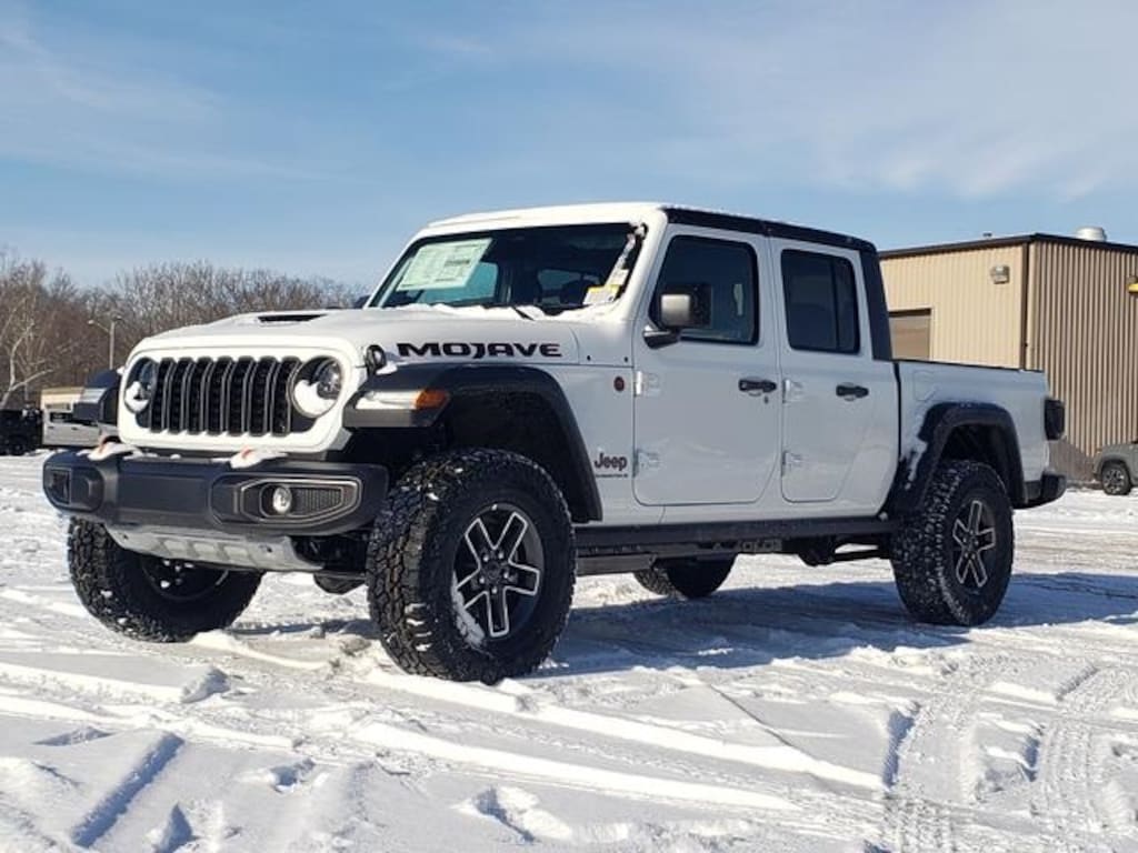 bright white clearcoat 2026 Jeep Gladiator Mojave 4WD 8-Speed Automatic 3.6L V6 24V VVT 110 Mph Vehicle Max Speed Calibration, 12.3" Touchscreen Display, 4-Wheel Disc Brakes, 4.10 Rear Axle Ratio, 4G LTE Wi-Fi Hot Spot, 8 Speakers, ABS brakes, Air Conditioning, Alexa Built-in, Alloy wheels, AM/FM radio: SiriusXM with 360L, Apple CarPlay, Apple CarPlay/Android Auto, Automatic temperature control, Black 3-Piece Hard Top, Brake assist, Compass, Connectivity - US/Canada, Convenience Group, Delay-off headlights, Driver door bin, Driver vanity mirror, Dual front impact airbags, Dual front side impact airbags, Electronic Stability Control, Emergency communication system: Jeep Connect, Freedom Panel Storage Bag, Front anti-roll bar, Front Bucket Seats, Front Center Armrest w/Storage, Front dual zone A/C, Front fog lights, Front License Plate Bracket, Front reading lights, Fully automatic headlights, Google Android Auto, Heated door mirrors, Heated Front Seats, Heated Steering Wheel, Heavy Duty Suspension with Gas Shocks, Illuminated entry, Integrated roll-over protection, Low tire pressure warning, Manufacturer's Statement of Origin, MOPAR All-Weather Slush Mats, MOPAR Spray in Bedliner, MyFlexCare Service Plan, Occupant sensing airbag, Outside temperature display, Overhead airbag, Panic alarm, Passenger door bin, Passenger vanity mirror, Power door mirrors, Power steering, Power windows, Premium Cloth Seats with Sport Bolsters, Quick Order Package 24D Mojave, Radio data system, Radio: Uconnect 5 with 12.3" Display, Rear anti-roll bar, Rear reading lights, Rear Sliding Window, Rear Window Defroster, Remote keyless entry, Remote Start System, Security system, Speed control, Split folding rear seat, Steering wheel mounted audio controls, Tachometer, Telescoping steering wheel, Tilt steering wheel, Traction control, Trip computer, Universal Garage Door Opener, USB Host Flip, Variably intermittent wipers, Voltmeter, Wheels: 17" x 7.5" Dark Gray Painted.